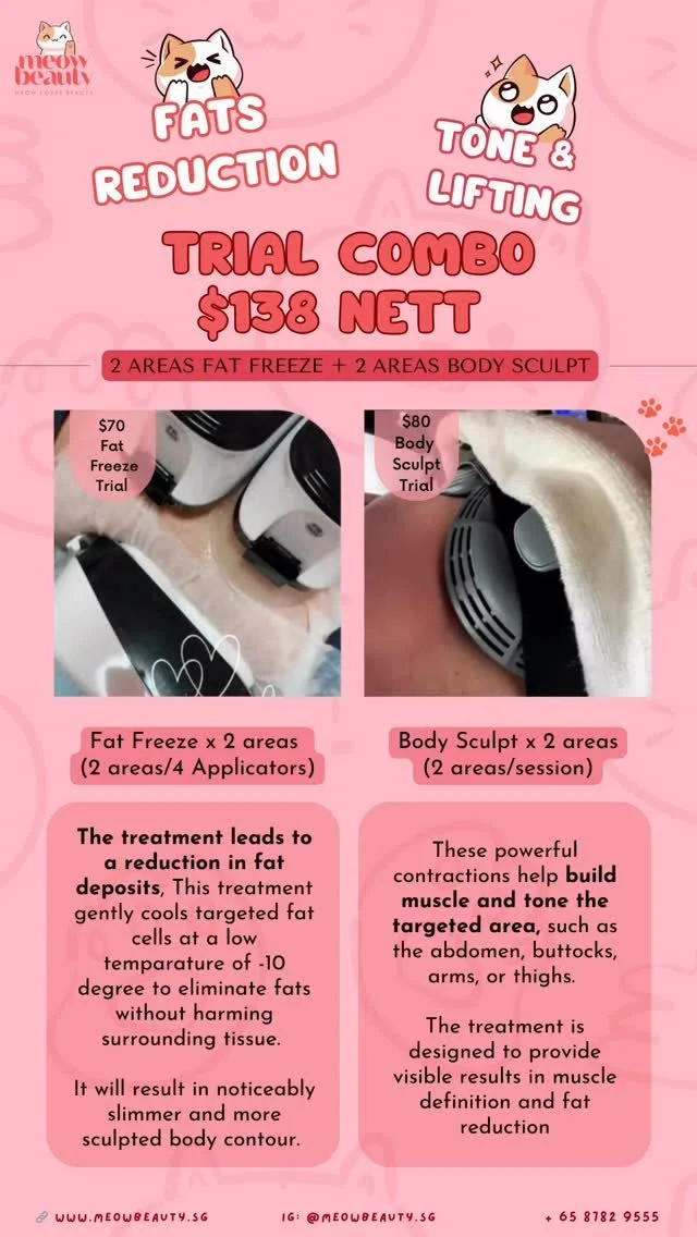 At Meow Beauty Bar, we provide a comprehensive range of treatments to pamper you from head to toe. From rejuvenating skincare facials to EMS Body Sculpt, Bipolar Treatment (3-1), Lymphatic Detox Blanket, Body/Face HIFU, and Hot Sculpting for fat reduction, we've got every inch of you covered!